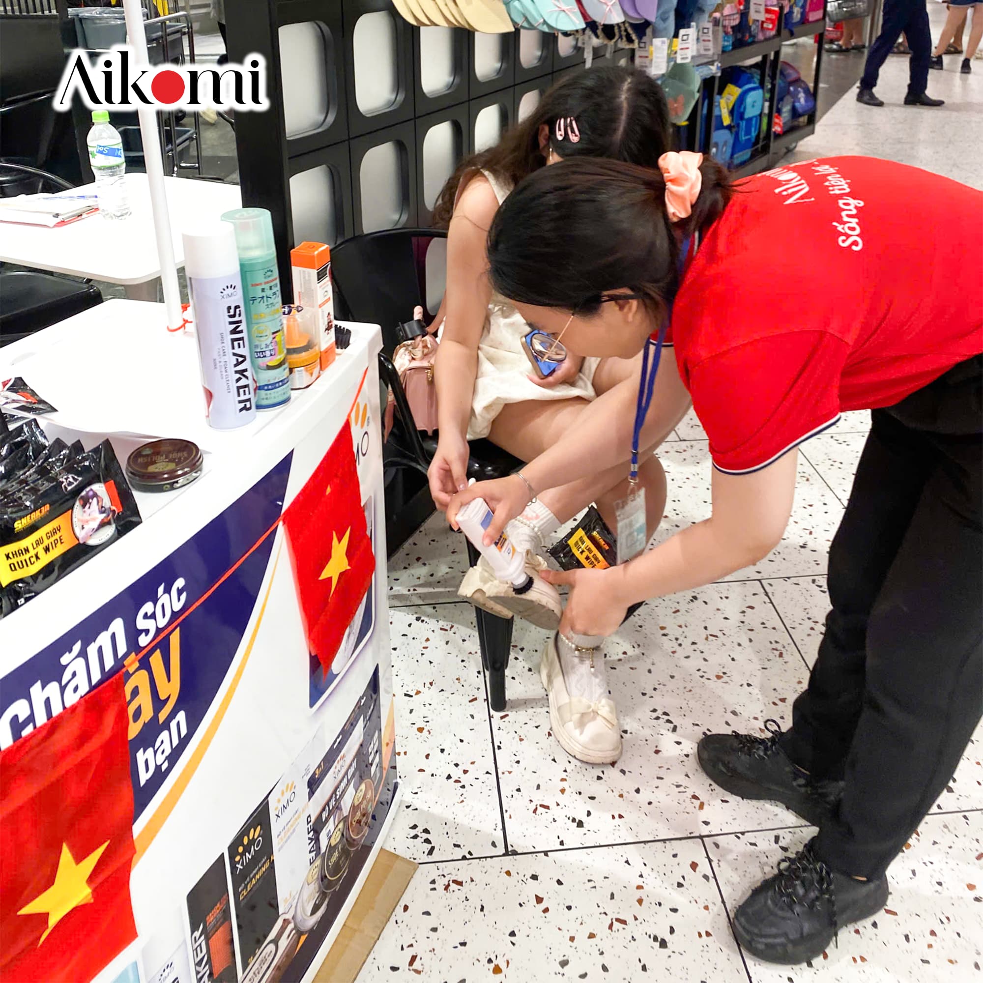 Khách hàng đến với gian hàng Aikomi không chỉ được trải nghiệm sản phẩm chăm sóc giày Ximo, mà còn được hưởng dịch vụ vệ sinh giày hoàn toàn miễn phí. Đây chính là điểm nhấn giúp gian hàng luôn tấp nập, bởi mỗi đôi giày được làm sạch không chỉ mang lại diện mạo mới mẻ mà còn khẳng định sự tận tâm của Aikomi trong việc chăm sóc từng chi tiết nhỏ trong cuộc sống hằng ngày.