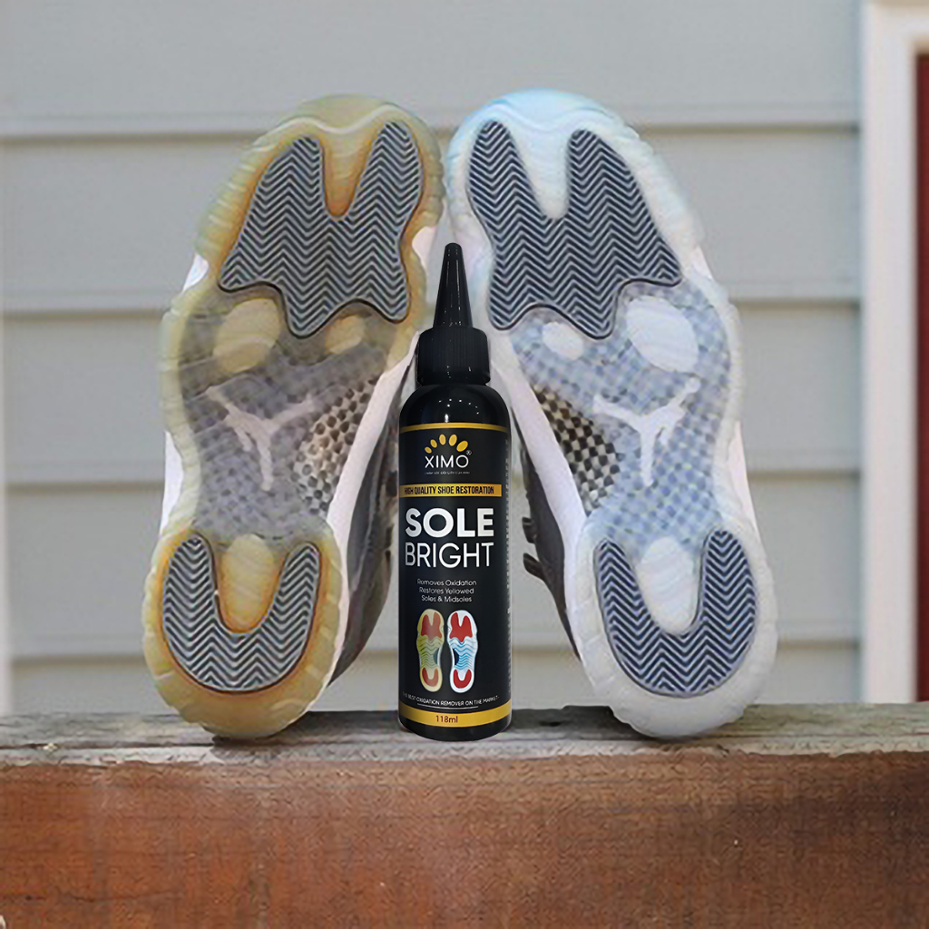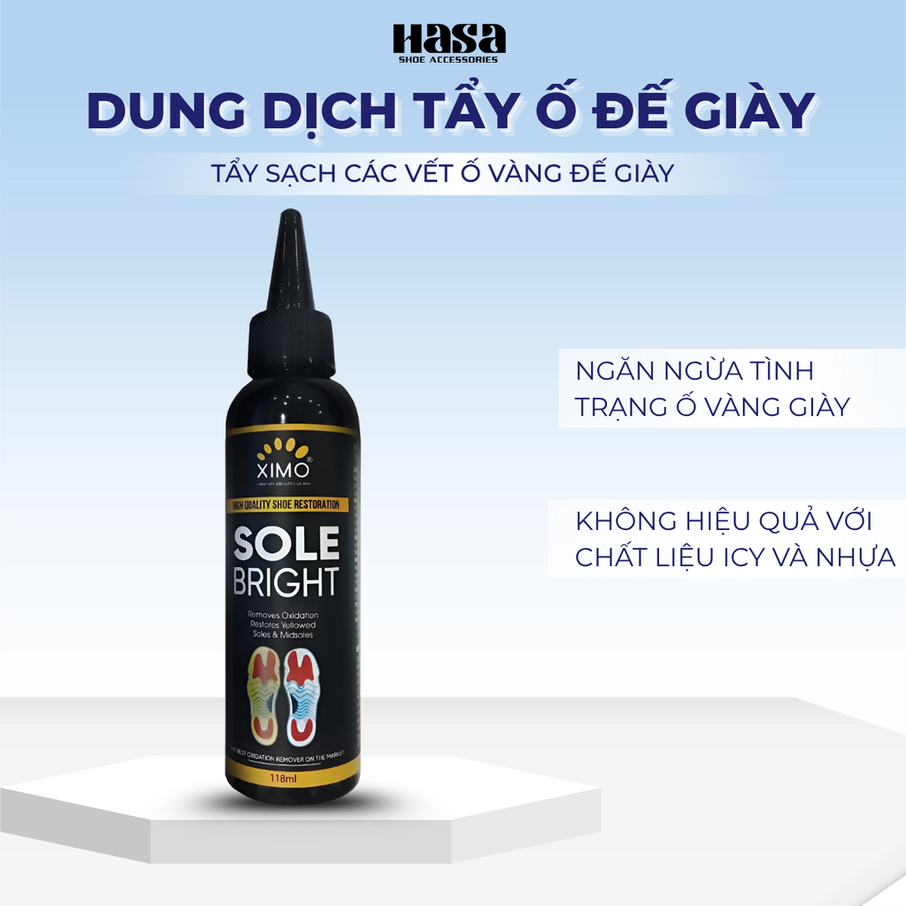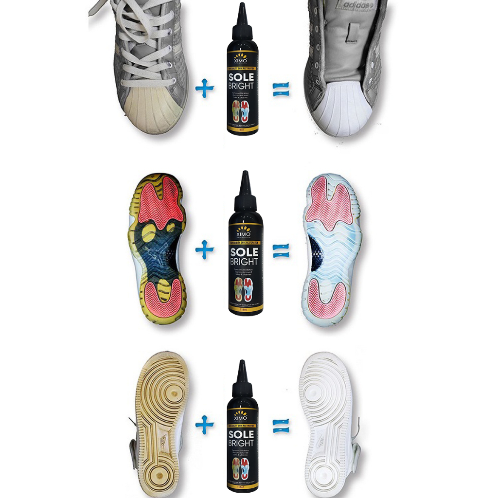 👉 Ximo Sole Bright giúp bạn dễ dàng tẩy ố vàng trên đế giày chất liệu icy, nhựa, cao su, đế cứng do bị oxy hoá lâu ngày. Mang lại sức sống mới cho đôi giày của bạn.