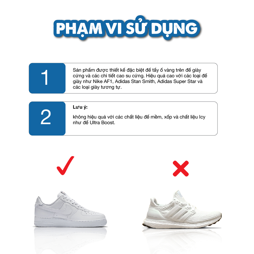 👉 Phạm vi sử dụng: đế giày Adidas Stan smith, Adidas Super Star, Gucci và các chi tiết đế cứng bị ố vàng