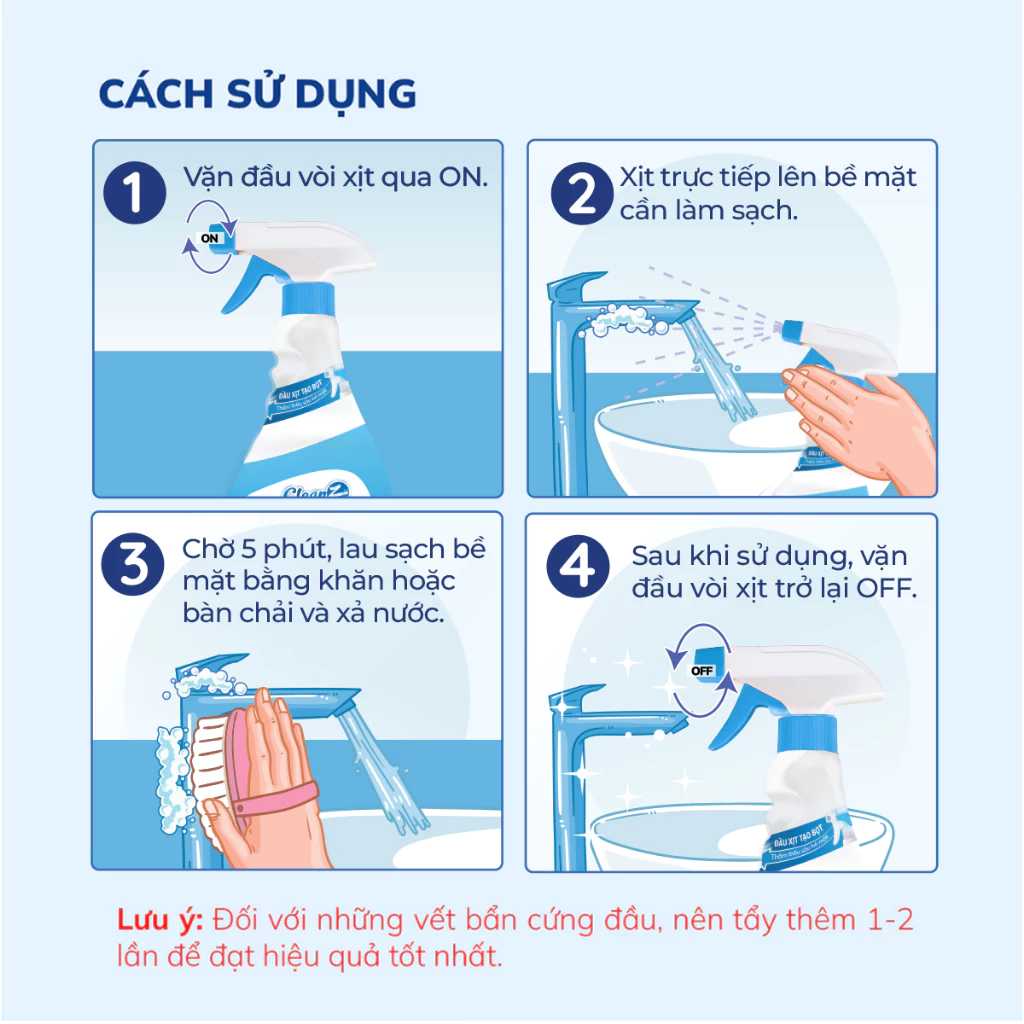 - Xịt trực tiếp lên bề mặt cần vệ sinh: bếp ga, bếp từ, mặt đá, inox, bồn rửa, kính, tay nắm cửa,...
