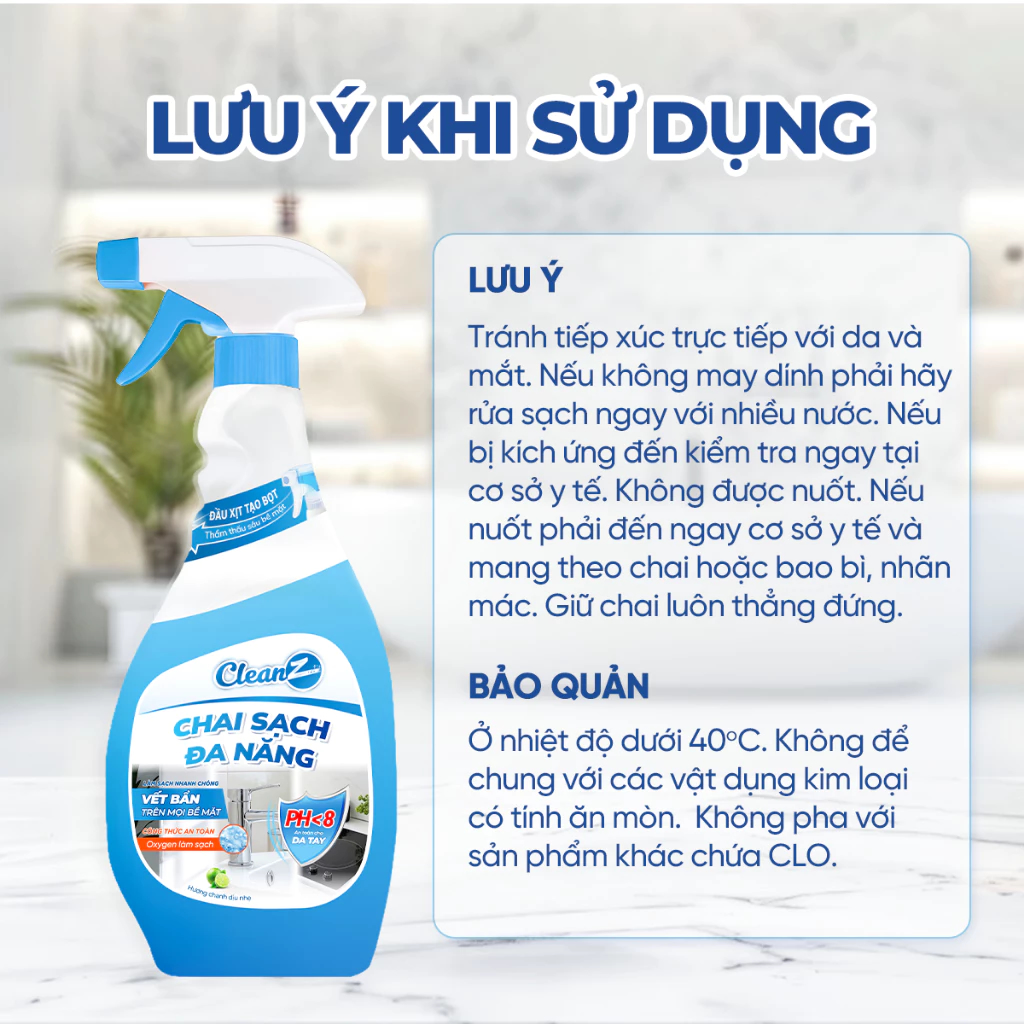 Để chai CleanZ ở nơi thoáng mát, tránh ánh nắng trực tiếp nhằm giữ chất lượng sản phẩm và độ ổn định của hương chanh.
