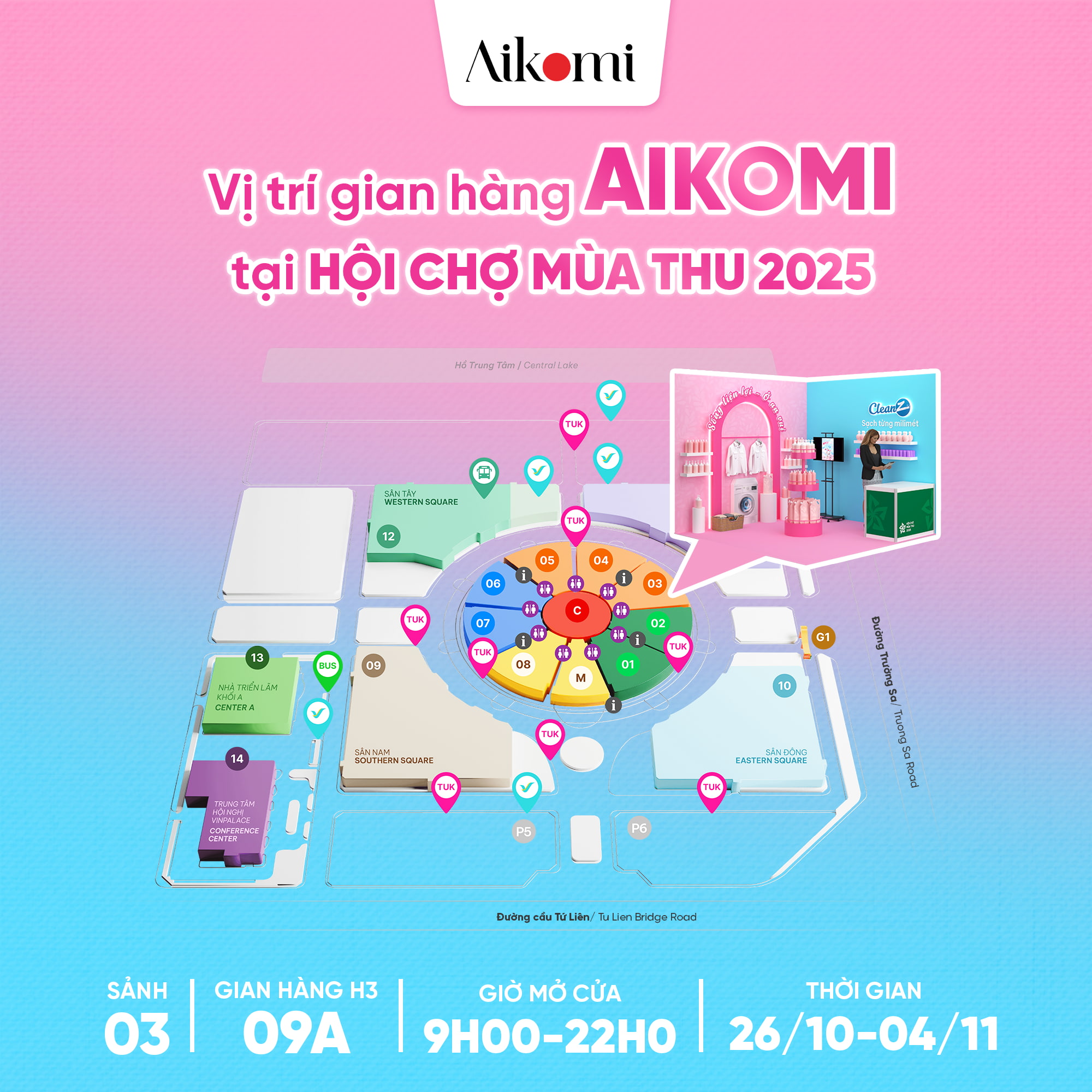 Tọa lạc tại khu H3 - Thu Gia Đình, gian hàng Aikomi nổi bật với tone màu hồng – trắng – xanh cùng thiết kế hiện đại, gần gũi và mang đậm dấu ấn thương hiệu Việt. Tại đây, khách tham quan sẽ được trực tiếp trải nghiệm các sản phẩm nổi bật của Aikomi, bao gồm: