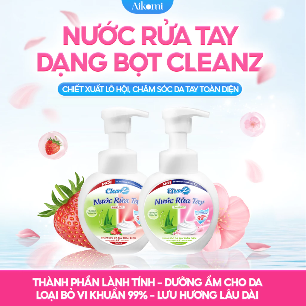 NƯỚC RỬA TAY DẠNG BỌT CLEANZ (300G) Trong sinh hoạt hàng ngày, tay luôn là nơi tiếp xúc với rất nhiều vi khuẩn nhất là trong các công việc trong nhà bếp, nếu không rửa tay thường xuyên để sạch khuẩn thì rất có khả năng cao sẽ ảnh hưởng đến vấn đề vệ sinh an toàn thực phẩm và cả sức khoẻ của bản thân. Với dòng sản phẩm nước rửa tay từ CleanZ có khả năng làm sạch đến 99,9% vi khuẩn cùng hương hoa anh đào tự nhiên để bàn tay bạn luôn được sạch sẽ và thơm tho, tránh được các vấn đề sức khoẻ do vi khuẩn gây ra và đảm bảo an toàn vệ sinh thực phẩm.