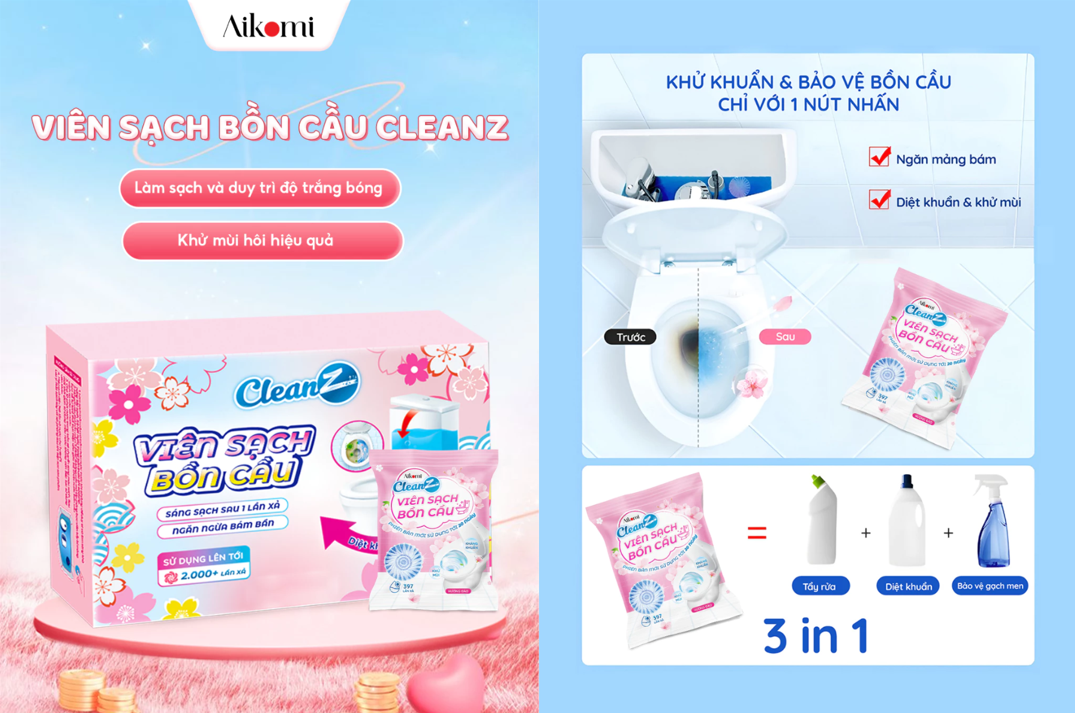 Nếu bạn đang tìm một sản phẩm an toàn – hiệu quả – tiện lợi, thì Viên sạch bồn cầu CleanZ từ nhà Aikomi là lựa chọn rất đáng thử. Đây là dòng viên sạch thông minh, được nhiều gia đình tin dùng nhờ khả năng làm sạch nhanh – sâu – lâu mà không cần tiếp xúc hóa chất.